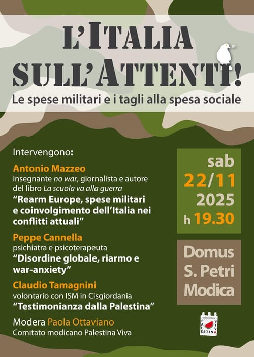 Antonio Mazzeo - Thursday, November 20, 2025#nowar - #Modica (#Ragusa), sabato 22 novembre 2025, ore 19.30 - L'Italia sull'attenti! Le spese #militari e i tagli alla #spesa sociale. Intervengono: Antonio Mazzeo (Rearm Europe, spese militari e coinvolgimento dell'Italia nei conflitti attuali); Peppe Cannella (Disordine globale, riarmo e war-ansiety); Claudio Tamagnini (Testimonianza dalla Palestina). Modera Paola Ottaviano (Comitato Modicano Palestina Viva).