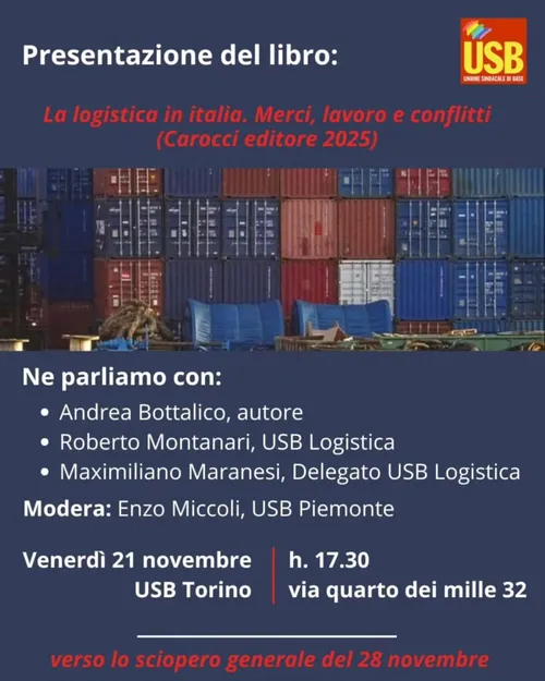Radio Blackout - Podcast - Friday, November 21, 2025Il primo argomento della puntata è stato quello della logistica, infatti in compagnia telefonica di Andrea Bottalico, abbiamo parlato del suo ultimo libro “Logistica in Italia. Merci, lavoro e conflitti”. Approfittando della prossima presentazione del testo edito da Carocci Editore a Torino presso la sede di USB, ripercorriamo assieme all’ autore il particolare sviluppo nel contesto economico/sociale/produttivo italiano di questo settore che è diventato sempre più strategico negli ultimi anni a livello internazionale.