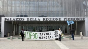 Pressenza - Friday, November 21, 2025Extinction Rebellion ha scaricato 30 tavoli verdi davanti al grattacielo della Regione Piemonte e aperto uno striscione “COP30: Tavoli Mancati”. Nei giorni conclusivi della conferenza sui cambiamenti climatici che si tiene a Belém, il movimento denuncia gli impegni disattesi da Governo e Regione nel contrasto alla crisi ecoclimatica e l’aperta opposizione del Governo alle politiche climatiche europee e alla COP30.