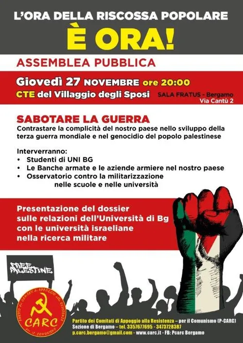 Per la prima volta l’Osservatorio contro la militarizzazione delle scuole e delle università sarà presente insieme agli studenti e alle studentesse universitari/e, ai collettivi palestinesi e alla cittadinanza a Bergamo all’incontro promosso dai Carc, che si terrà giovedì, 27 novembre 2025 presso il CTE del Villaggio degli Sposi, alla Sala Fratus alle ore 20.00.