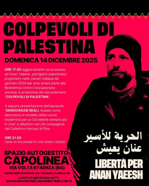 Faenza, 14 dicembre: A sostegno di Anan Yaeesh. Aggiornamenti, proiezione e discussione sulle “Democrazie reali”