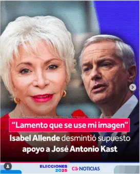 “Ciao, sono Isabel Allende e voglio dirvi che non sostengo il signor Kast e che sta circolando un video in cui compaiono alcune mie frasi estrapolate dal contesto… Mi dispiace che la mia immagine venga utilizzata per fini politici.”