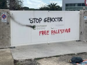 “Blocchiamo tutto per cambiare tutto – lo slogan del presidio – Vogliamo più soldi per l’istruzione e la salute e non per le armi. Vogliamo che le nostre aziende siano eccellenze di vita, non di morte. Per una vita dignitosa e libera dall’oppressione delle guerre, per la giustizia sociale. Per la Palestina, per la libertà di tutti”.
