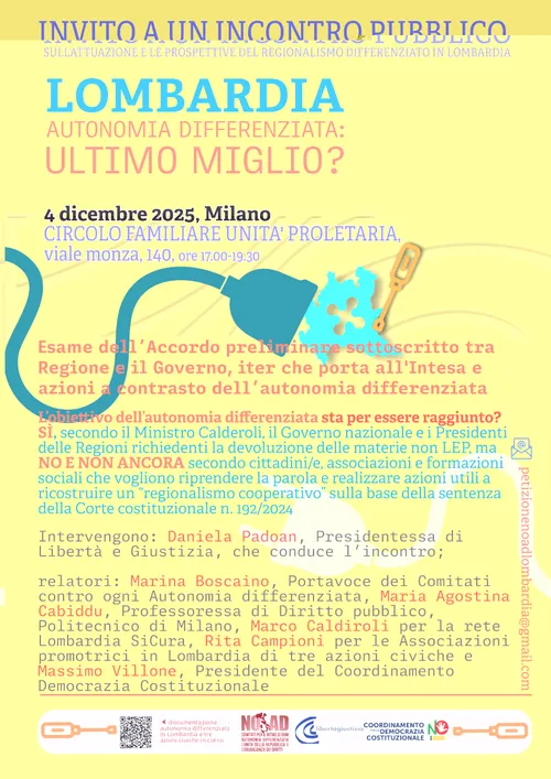 relatori: ๐๐๐ซ๐ข๐ง๐ ๐๐จ๐ฌ๐๐๐ข๐ง๐จ โ Portavoce dei Comitati contro ogni Autonomia differenziata, ๐๐๐ซ๐ข๐ ๐๐ ๐จ๐ฌ๐ญ๐ข๐ง๐ ๐๐๐๐ข๐๐๐ฎ โ Professoressa di Diritto pubblico, Politecnico di Milano, ๐๐๐ซ๐๐จ ๐๐๐ฅ๐๐ข๐ซ๐จ๐ฅ๐ข โ Lombardia SiCura, ๐๐ข๐ญ๐ ๐๐๐ฆ๐ฉ๐ข๐จ๐ง๐ข per le Associazioni promotrici in Lombardia di tre azioni civiche e ๐๐๐ฌ๐ฌ๐ข๐ฆ๐จ ๐๐ข๐ฅ๐ฅ๐จ๐ง๐ โ costituzionalista e Presidente del Coordinamento Democrazia Costituzionale