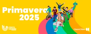 Intanto, è in pieno svolgimento l’edizione primavera 2025 di Streets For Kids: tra il 5 Maggio e il 23 Maggio 2025 genitori, insegnanti e bambini in tutte le città d’Europa sono mobilitati per chiedere un maggior numero di Strade Scolastiche, aria pulita, spazi per giocare e percorsi casa-scuola in sicurezza: https://italy.cleancitiescampaign.org/streets-for-kids-primavera-2025/.