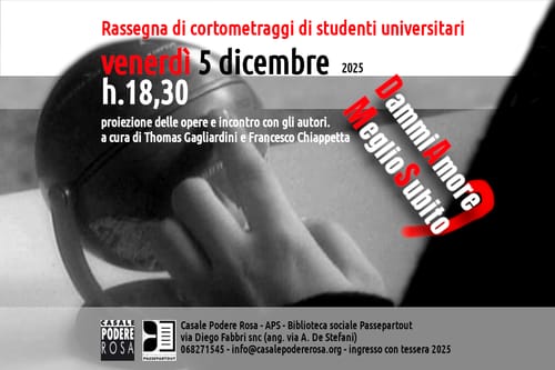 Casale Podere Rosa - Monday, December 1, 2025Rassegna mensile di cortometraggi di studenti universitari (e non solo!) e incontro con gli autori. A cura di Thomas Gagliardini e Francesco Chiappetta Dammi Amore Meglio Subito – 2025 venerdì 5 dicembre dalle ore 18,30 al Casale Podere Rosa (il programma della giornata prevede una pausa per la cena) Presentazione di film corti realizzati dagli …