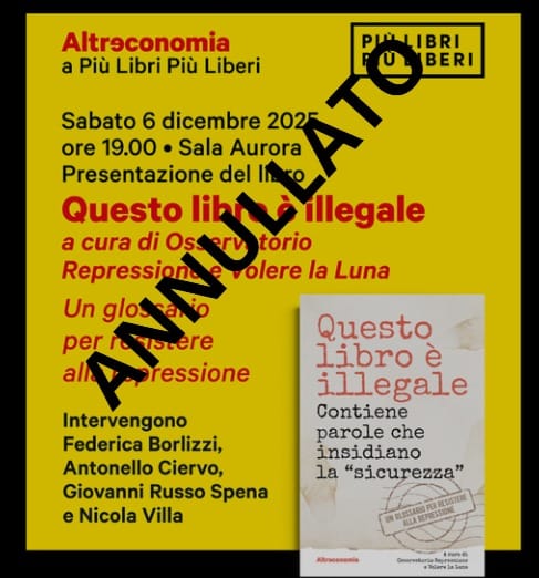 Osservatorio Repressione - Friday, December 5, 2025Le associazioni Osservatorio Repressione e Volere la Luna, insieme ai relatori Federica Borlizzi, Giovanni Russo Spena e Antonello Ciervo, annunciano la cancellazione della presentazione del volume “Questo libro è illegale. …