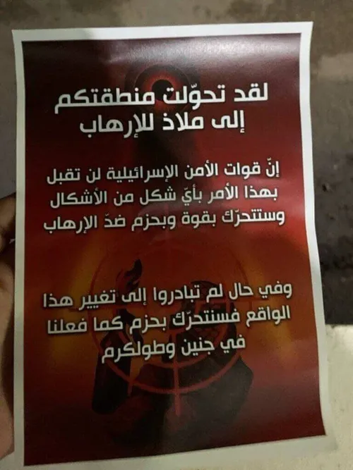 Il 1° dicembre le forze di occupazione hanno distribuito volantini agli abitanti di Tubas con il seguente testo, contenente una chiara minaccia ai danni alla popolazione locale. Il volantino recitava: