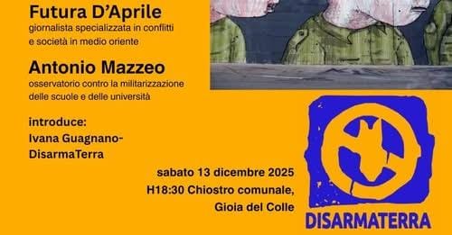 “FERMARE IL RIARMO: economia di guerra, militarizzazione e servitù militari” è il titolo del secondo incontro pubblico organizzato dal neo costituito Forum “Disarma Terra” di Gioia del Colle, previsto per sabato 13 dicembre, alle ore 18:30, presso il chiostro comunale della città. https://osservatorionomilscuola.com/2025/12/09/gioia-del-colle-13-dicembre-fermare-riarmo-economia-guerra-militarizzazione/