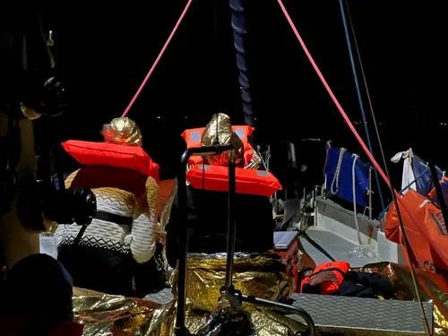 Il secondo soccorso non ci trova impreparati. È solo preceduto da una notte senza fine in cui partiamo alla ricerca di una barca che non troveremo mai segnalata da AP con più di 60 persone a bordo. Le cerchiamo per ore senza successo.