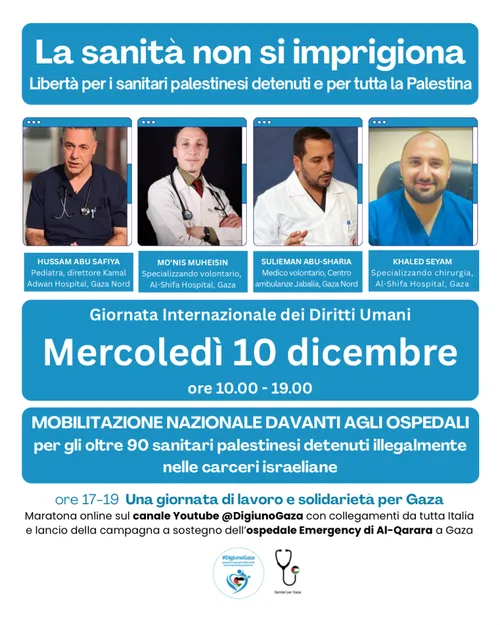 Radio Blackout - Info - Thursday, December 11, 2025Sono oltre 60 gli ospedali che si sono mobilitati in tutta Italia con flash mob e presidi per la liberazione degli oltre 90 sanitari palestinesi detenuti illegalmente nelle carceri israeliane. Un giornata organizzata in occasione della data nazionale e internazionale di mobilitazione “La sanità non si imprigiona”.