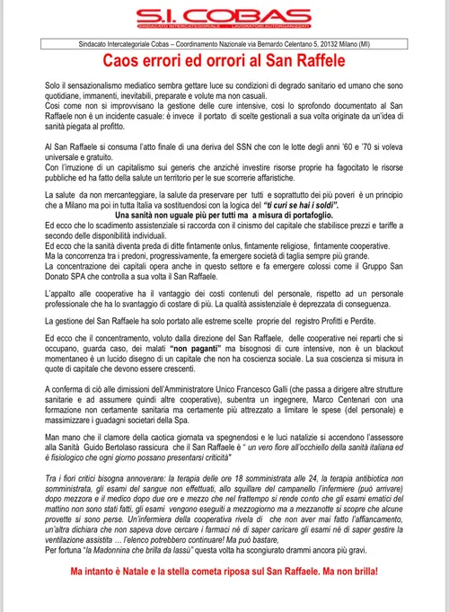 L'articolo Caos errori ed orrori al San Raffaele proviene da S.I. Cobas - Sindacato intercategoriale.
