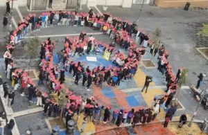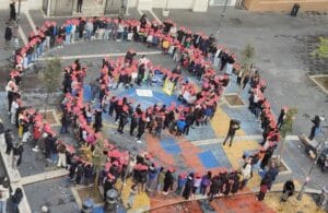 Rinviata per maltempo il 25 novembre, l’iniziativa pubblica si è tenuta in Piazza dell’Immacolata, cuore popolare di San Lorenzo. Le alunne e gli alunni dell’I.C. Tiburtina Antica 25 (plesso primaria Saffi e secondaria G. Borsi) hanno composto un grande “simbolo umano” della nonviolenza: due cerchi— l’individuo e la società — uniti da due braccia, a rappresentare che la nostra umanità è intrecciata con quella delle altre persone. Un gesto semplice e potente, capace di trasformare lo spazio urbano in un messaggio corale contro ogni forma di violenza. Un invito rivolto a tutta la comunità, a costruire legami che nutrono, proteggono e fanno crescere tutte e tutti liberi dalla violenza.