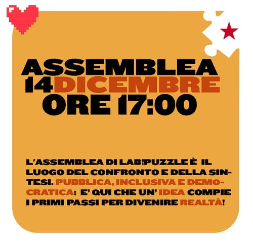 LABPUZZLE – Bene Comune - Friday, December 12, 2025🏠𝐋’𝐀𝐒𝐒𝐄𝐌𝐁𝐋𝐄𝐀L’assemblea di Lab!Puzzle è libera, pubblica, democratica, antifascista, antisessista e antirazzista, prerogative che riteniamo indispensabili per il vivere civile ed un confronto sano. Si tiene ogni prima domenica del mese alle ore 17:00, salvo quando diversamente specificato. ✏️ 𝐎𝐑𝐃𝐈𝐍𝐄 𝐃𝐄𝐋 𝐆𝐈𝐎𝐑𝐍𝐎:L’odg si redige in mailing list ed è in continuo aggiornamento. Per iscriversi occorre partecipare […]