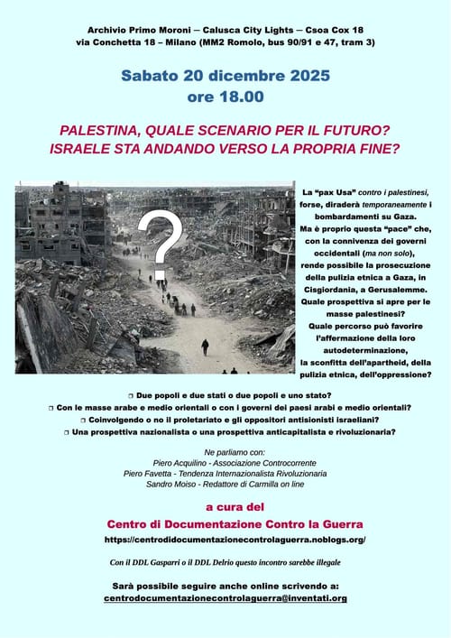 english below Archivio Primo Moroni - Calusca City Lights - CSOA Cox 18 via Conchetta 18 – Milano (MM2 Romolo, bus 90/91 e 47, tram 3) Sabato 20 dicembre 2025, ore 18   PALESTINA, QUALE SCENARIO PER IL FUTURO? ISRAELE STA ANDANDO VERSO LA PROPRIA FINE? La “pax Usa” contro i palestinesi, forse, diraderà temporaneamente i bombardamenti […]