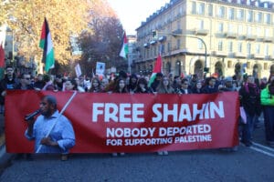 Il corteo si è fermato in vari punti strategici, ad esempio davanti alla sede della Regione Piemonte, sottolineando l’incoerenza del Consiglio Regionale che ha rifiutato di discutere  una mozione per chiudere tutte le collaborazioni con Israele, si è fermato davanti al Palazzo di Città, la sede del Consiglio comunale, per denunciare il fatto che il Comune nelle ultime due settimane non si è pronunciato rispetto all’arresto ed alla di Mohamed Shahin;  a lui sono stati dedicati parte degli interventi lungo il corteo, chiedendone la liberazione immediata e il ritorno alla sua famiglia.