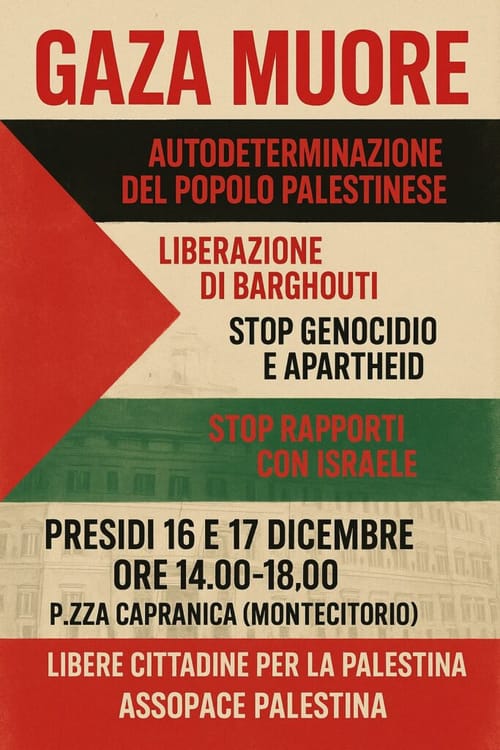 Martedì 16 e mercoledì 17, dalle 14:00 alle 18:00, presidi a Piazza Capranica (Montecitorio) per: Gaza che Muore, Liberazione di Barghouti, Stop al Genocidio e all’Apartheid, Stop Rapporti con Israele.