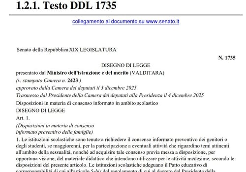Analizziamo il testo di legge (4 articoli) sul consenso informato preventivo che il 3 dicembre la Camera ha approvato e che adesso passa al Senato: passiamo in rassegna la serie di paletti, compreso nessuno stanziamento economico, che impediranno di fatto qualsiasi seria educazione sessuoaffettiva nelle scuole, in orario scolastico o extra. I crediti di Sasso a Pro Vita.