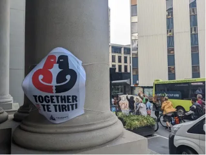 Passeggiando per la città, nel periodo in cui sono arrivato, era impossibile non imbattersi in locandine e manifesti sulla questione attualmente più al centro del dibattito pubblico neozelandese. Dalle bacheche universitarie alle finestre delle case si trovano bandiere e cartelli con una grafica bianca-rosso-nera con la scritta, a volte in Māori a volte in inglese, «Toitū te Tiriti», «Honour The Treaty»: Onora il Trattato.