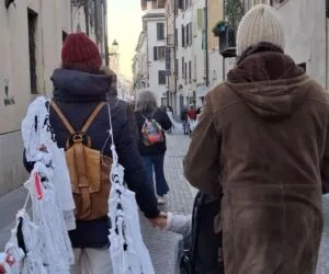 La città non si è fermata del tutto, e non era necessario che lo facesse. È bastato che ci vedesse. Attraversando il centro storico, le vie strette, le piazze luminose, le pietre antiche, la vita quotidiana si intrecciava al nostro passaggio. Persone che rallentavano, che si voltavano, che seguivano con lo sguardo quel bianco in cammino. Qualcuno si è fermato, qualcuno si è unito per un tratto, qualcuno si è fatto serio. È stato un silenzio diverso, un silenzio di rispetto, quello che nasce quando si comprende, anche solo per un istante, che ciò che passa riguarda l’umanità intera.