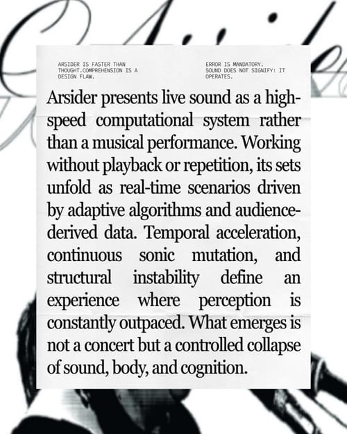 Arsider operates within a framework of accelerationist sound practice, redefining performance as a real-time computational system. By exceeding perceptual synchronization thresholds and denying stable repetition, the project destabilizes predictive listening models and mnemonic consolidation. Sampling functions as an adaptive process rather than referential citation, while error is embedded as a structural condition. The listener is repositioned as a node within an unstable feedback network, raising questions about agency, embodiment, and cognition in algorithmically driven sonic environments.