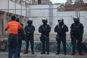 «Nonostante il tempo inclemente, nonostante le mediazioni, nonostante tutto, sembra essere più importante l’opinione di un singolo, il sindaco in questo caso, che ha criminalizzato la maggioranza delle persone» mi spiega una persona che vive nel quartiere. «Hanno strumentalizzato i vicini, ma qui si può vedere quanti siamo davvero». Fin dalla prime ore del mattino, infatti, decine di persone sono accorse per donare sostegno alla causa. Residenti del vicinato, collettivi impegnati nella lotta per il diritto alla casa e sindacati antirazzisti situati di fronte al cordone della polizia hanno espresso la loro solidarietà con cori e urla mentre osservavano le persone uscire dalla struttura con i propri averi. Solo mezz’ora dopo l’inizio dello sgombero si sono verificati momenti di tensione: gli agenti della Àrea de Brigada Mòbil (BRIMO), schierati in assetto antisommossa per impedire l’accesso ai manifestanti, hanno iniziato a caricare le persone, tra cui chi è accorso per protestare e chi aveva appena subito lo sgombero, con spintoni e manganellate.