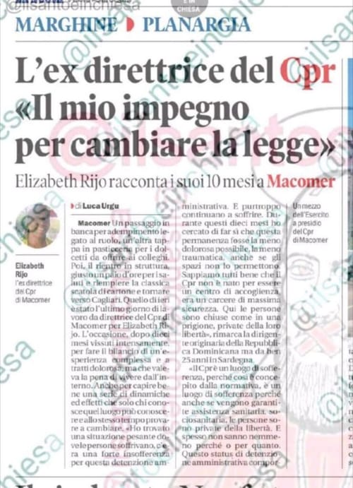Rifiuti - Wednesday, December 31, 2025Un risultato ottenuto anche grazie alle nostre battaglie sono le dimissioni, annunciate nelle pagine della stampa locale, dell’ormai ex direttrice del CPR Elizabeth Rijo, responsabile di una gestione fatta di pestaggi, violenze, psicofarmaci, cibo scadente, umiliazioni e trattamenti degradanti. Non la dimenticheremo; ci incontrerà negli eventi pubblico a cui parteciperà, perchè vogliamo ricordarle nomi e …