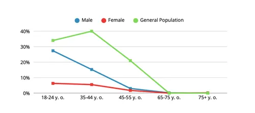 - 76% identify as men, 74% are between 18-34 years old