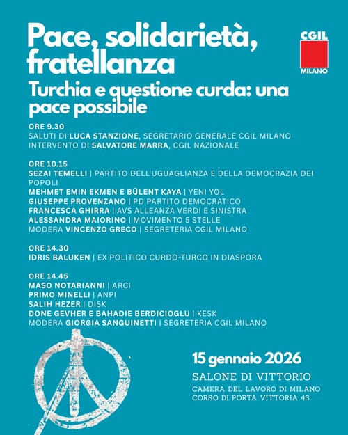 Segnaliamo e invitiamo a partecipare alla conferenza “Pace, solidarietà, fratellanza — Turchia e questione curda: una pace possibile”, promossa da CGIL Milano. La conferenza si terrà il 15 gennaio 2026 presso il Salone Di Vittorio – Camera del Lavoro di Milano, Corso di Porta Vittoria 43, Milano. L’iniziativa intende aprire uno spazio di confronto pubblico su pace, diritti e democrazia, con contributi di esponenti del mondo sindacale, politico e associativo, e testimonianze dirette legate alla questione curda. La partecipazione è gratuita fino a esaurimento posti.