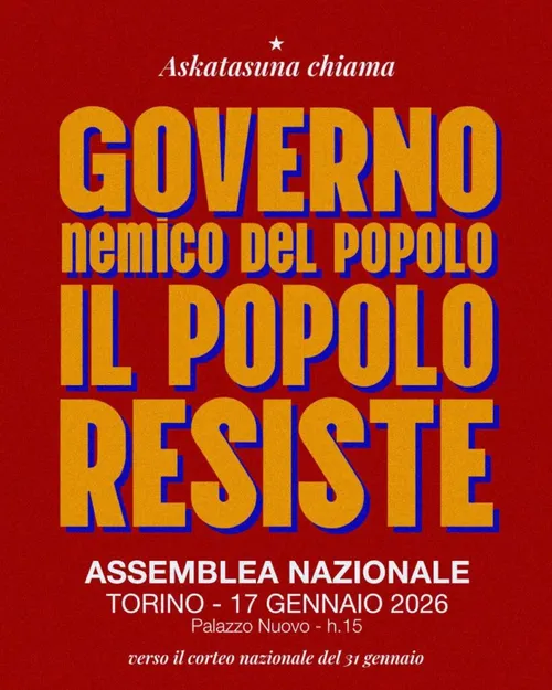 Osservatorio Repressione - Wednesday, January 7, 2026Sabato 17 gennaio alle ore 15 all’università Palazzo Nuovo di Torino si terrà l’assemblea nazionale verso il corteo del 31 gennaio a seguito dello sgombero del centro sociale Askatasuna. Di …