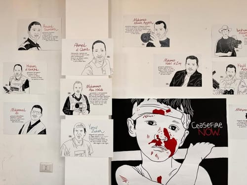 Una foto della mostra “Nel mirino della memoria” (ospitata in diverse città, in ottobre a Bari), con i disegni di Gianluca Costantini dedicati ai giornalisti uccisi a Gaza Tristezza, rabbia, paura hanno segnato l’anno 2025: il genocidio è diventato parte di un panorama sinistro che la maggior parte degli umani segue con orrore senza poter fermare gli assassini sionisti. Il travolgente incalzare dell’onda trump-putinista sommerge la civiltà del diritto, e cancella sprezzante la compassione per il dolore altrui.