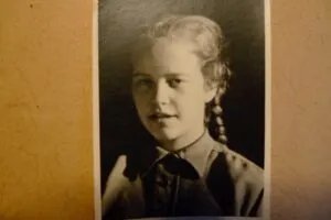 Nell’autunno del 1944, credo fosse ottobre, un giorno bussai alla porta di quella zia, ma invece di aspettare che mi dicesse “avanti”, aprii subito la porta. Con mio grande spavento, trovai un uomo sconosciuto nel suo letto! Volevo richiudere subito la porta, ma lui mi fece cenno di avvicinarmi, mi chiese chi fossi e poi mi spiegò che era il marito di mia zia, il fratello di mio padre, e che non dovevo dire a nessuno che era lì. Annuii confusa, sapevo comunque che questo fratello di mio padre era un pilota dell’aeronautica militare, uscendo vidi la sua uniforme appesa su una sedia e rimasi sbalordita. Perché pensai: se non posso dire a nessuno che questo zio è qui, significa che non è in licenza. Ma questo significa che ha disertato. E questo significa che è un traditore del Führer, del popolo e della patria! Un codardo! Quindi devo denunciarlo!