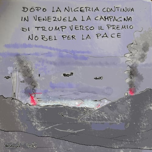 …beh… se serve di Benigno Moi Assodato che le vignette non vanno spiegate… ma sono un sasso buttato come spunto di riflessione, per ogni vignetta almeno un link (forse) Corsa al Nobel     Comma 22 a Gaza “Servi dei servi dei servi”… Rimpianti     L’origine del nome dato alla rubrica Furundulla: hastagasa La Furundulla precedente:  301 Ops quest’anno mi