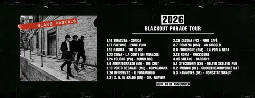 Blake Rascals: pubblicato da pochissimo il singolo BLACKOUT PARADE per il trio marchigiano, assieme ad uno stiloso video che accompagna la canzone, dove i nostri sono ripresi in azione durante il recente tour in UK. Tanti concerti in arrivo nel 2026 per questa sorprendente band!