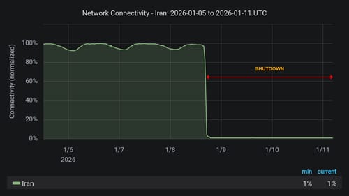 Concludiamo con un approfondimento sul blocco di Internet in Iran. Mentre le proteste vanno avanti, la sera dell'8 Gennaio il blocco è diventato pressoché totale: dall'Iran non c'è più connettività con altri paesi.