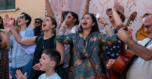 Per le vie di Torpignattara, a Roma, con canti in romanesco, bangla, arabo, inglese, portoghese e russo scambiati con verdure, indispensabili per il minestrone di quartiere: “La banda del minestrone” è un’iniziativa immaginata e realizzata (giugno 2024) da Asinitas (foto di Luisa Fabriziani – che ringraziamo – tratta dalla pag fb di Asinitas)
