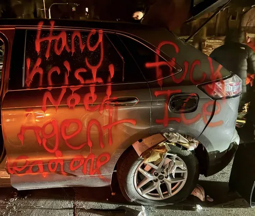Ho fatto inversione e ho girato intorno all’isolato. Sono uscito dall’altra parte della linea di scontro. Anche da questa parte c’era una folla di giovani. Stavano distruggendo due SUV che ho riconosciuto immediatamente come veicoli dell’ICE grazie ai finestrini oscurati e alle targhe di altri stati. I ragazzi prendevano a calci i finestrini. Qualcuno sventolava con orgoglio una grande bandiera messicana. Una ragazza è saltata sul cofano e ha sfondato il parabrezza con un calcio. Qualcuno con una bomboletta di vernice spray rossa ha scritto “HANG KRISTI NOEM” sul lato dell’altra auto.
