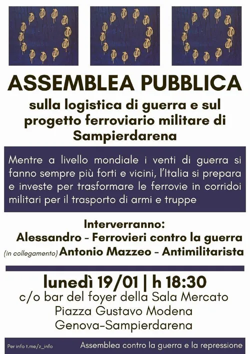 #Genova Sampierdarena - lunedì 19 gennaio ore 18,30 - Assemblea pubblica sulla logistica di #guerra e sul progetto ferroviario #militare di #Sampierdarena.