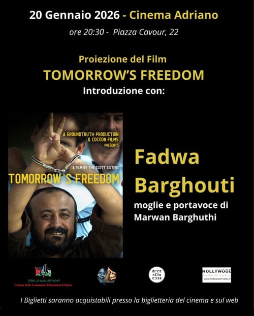 Martedì 20 gennaio 2026, ore 20:30 al Cinema Adriano, piazza Cavour 22, Roma, sarà proiettato il film “Tomorrow’s freedom” con un’introduzione di Fadwa Barghouti, moglie e portavoce di Marwan.
