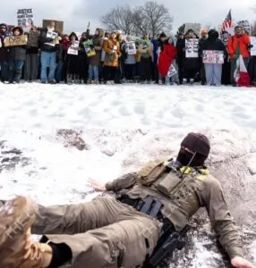 Al di là dello spettacolo degli agenti in tenuta mimetica che scivolano sulle lastre di ghiaccio, questo momento rivela qualcosa di più profondo sullo scontro: un conflitto tra un apparato federale altamente militarizzato e una comunità radicata nell’esperienza vissuta.