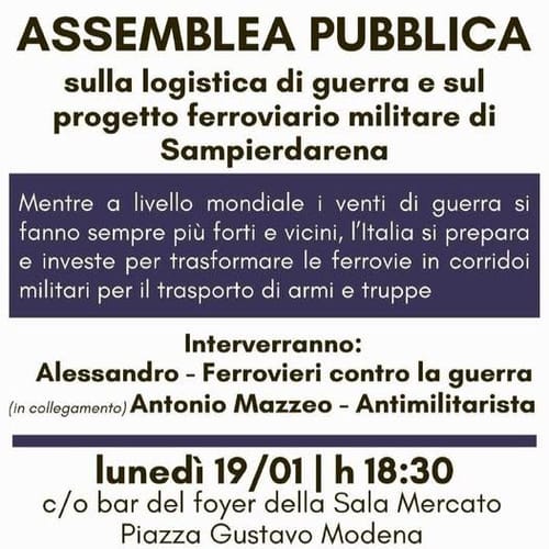 #Genova Sampierdarena - Oggi lunedì 19 gennaio ore 18,30 - Assemblea pubblica sulla logistica di #guerra e sul progetto ferroviario #militare di #Sampierdarena.