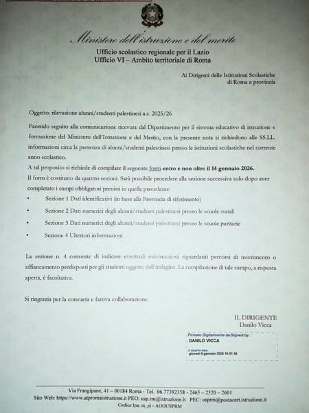 L’arrivo nelle scuole di una circolare in cui si chiede di censire il numero degli studenti palestinesi scatena durissime reazioni. Le risposte tardive e le motivazioni confuse del Ministero non riescono a dissipare i dubbi.