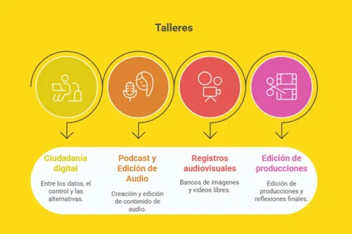 Durante cuatro encuentros, entre julio y septiembre de 2025, docentes y estudiantes exploraron herramientas digitales libres, reflexionaron sobre el uso de datos y experimentaron con producción de contenidos en audio y video. Todo el proceso estuvo acompañado por materiales pedagógicos, asistencia técnica —presencial y virtual— y una metodología participativa que promovió el aprendizaje colectivo.