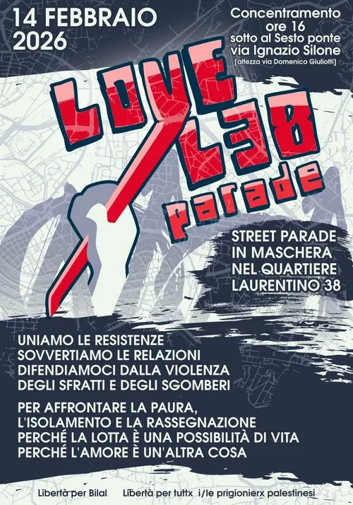 L38Squat - Friday, January 23, 2026A San Valentino vogliamo portare una festa per le strade del Laurentino 38.Una festa per chi desidera, una festa per chi resiste, una festa per chi prova a realizzare i sogni più assurdi, una festa di chi ha bisogno di solidarietà per trovare la forza. Una Love L38 Parade con tutto l’amore per chi non può stare … Leggi tutto "A San Valentino vogliamo portare una festa per le strade del Laurentino 38"