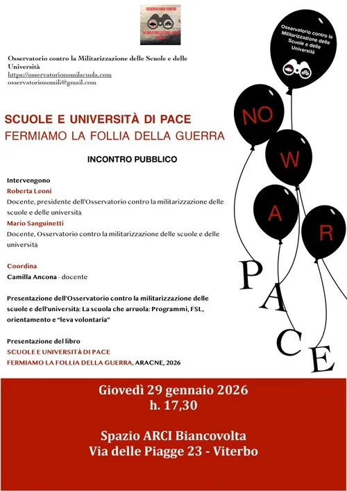 Si svolgerà giovedì 29 gennaio 2026 a partire dalle ore 17:30 presso lo Spazio ARCI Biancovolta in via delle Piagge 23 a Viterbo la prima presentazione in assoluto del libro SCUOLE E UNIVERSITÀ DI PACE. FERMIAMO LA FOLLIA DELLA GUERRA, ARACNE, 2026, volume che raccoglie gli atti del II Convegno nazionale dell’Osservatorio contro la militarizzazione delle scuole e delle università che si è svolto a Roma il 16 maggio 2025 presso lo Spin Time.