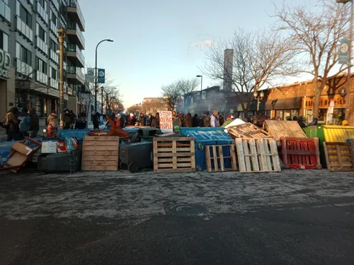 Alla fine della strada, più vicino a Nicollet, c’era una fila di poliziotti in tenuta antisommossa della MPD. Li ho riconosciuti dai giubbotti gialli. Tra noi e la polizia, più vicino alla Blaisdell Arena, un gruppo di persone stava costruendo una barricata con cassonetti, bidoni della spazzatura, blocchi di cemento e pallet di legno. Sentivamo i familiari cori di “FUCK ICE, ICE OUT!” La gente batteva sui bidoni a ritmo di musica. Qualcuno stava spargendo quelli che sembravano essere dei triboli fatti in casa davanti alla barricata.