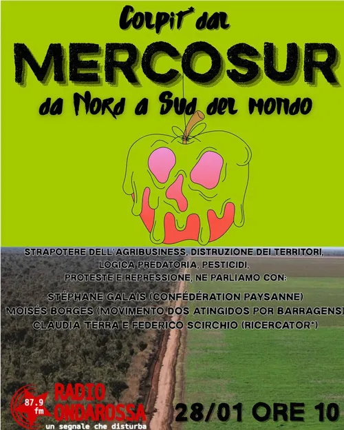 Radio Onda Rossa - Wednesday, January 28, 2026In questo redazionale proveremo ad attraversare le contraddizioni relative al trattato UE-Mercosur, ascoltando voci che arrivano dal Brasile, dalle mobilitazioni francesi contro l’agricoltura industriale e da ricercatorx italianx che da tempo analizzano criticamente questo accordo. Un percorso per capire cosa c’è davvero dietro il trattato UE-Mercosur e perché rappresenta una minaccia concreta per il clima, i territori e l’autodeterminazione dei popoli.