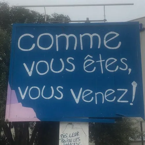 In questa monocromia di torri, rotatorie e recinzioni di filo spinato, l’occhio cerca un punto d’incontro. Una macelleria, un negozio di alimentari, qualche take away, una fermata dell’autobus affollata. Ci sono pochi posti dove sedersi e condividere un po’ di tempo. E poi, dopo la noia di una rotatoria desolata, accanto a un cartello comunale che insiste, con ottimismo amministrativo, che “Marsiglia si trasformi”, appare un’insegna diversa. Un invito semplice: “Comme vous êtes, vous venez!”.