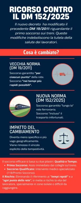 Un gruppo di lavoratori e RLS, assieme ad alcune Organizzazioni sindacali (USB- CAT- CUB-Trasporti), con il contributo della Cassa di Solidarietà tra ferrovieri, interpretando il sentimento di moltissimi lavoratori, hanno presentato ricorso al TAR contro il Decreto Ministeriale n. 152/25, riguardante le modalità di applicazione del primo soccorso in ambito ferroviario. La richiesta di annullamento è motivata dalla riduzione delle tutele per il personale che opera sulle linee, macchinisti, capitreno e manutentori, poiché il provvedimento del governo ha cancellato l’obbligo per le imprese ferroviarie, previsto dalla normativa precedente, di prestare ai lavoratori interessati il primo soccorso in linea “nei tempi più rapidi possibili e in ciascun punto della linea”.