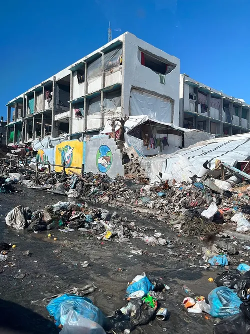 Una scuola parzialmente distrutta con cumuli di immondizia e macerie che ricoprono le strade di Jabaliya. La scuola non disponeva di acqua potabile né di servizi igienici ed era utilizzata come rifugio di emergenza dai palestinesi sfollati. 31 gennaio 2024. (Foto di Jonathan Whittall.)